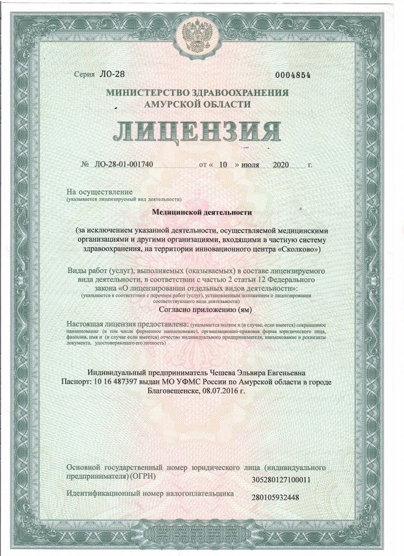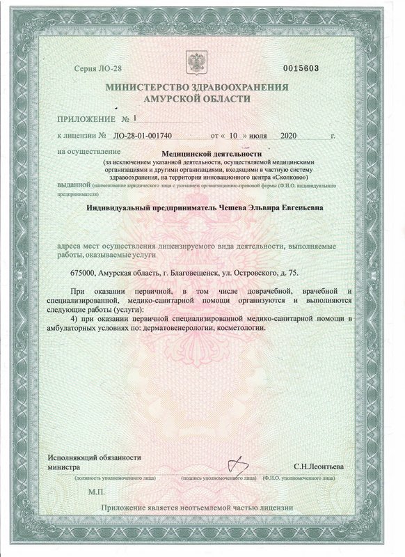 Чешева Эльвира Евгеньевна работает как косметолог. Она знает: регулярный уход за кожей полезен для ее состояния. Покраснения, появление мелких морщинок и другие возрастные изменения, конечно, огорчают, но не должны становиться поводом для уныния! В арсенале современной косметологии припрятаны десятки методов, которые позволят вам выглядеть здоровым и отдохнувшим даже в непростых условиях современной городской среды - например, процедуры, на которых специализируется Эльвира Евгеньевна: мануальная, атравматическая, комбинированная, механическая чистка лица, удаление бородавок, кератом, невусов, очагов себорейного кератоза, папиллом век, пигментных пятен, алмазный, молочный, энзимный, фруктовый, химический, жёлтый, гликолевый, кислородный и кислотный, миндальный, отбеливающий, салициловый, ультразвуковой пилинг, а также пилинг гиалуроновой кислотой, пилинг для волос, пилинг тела, пилинг ТСА, лечение растяжек, аппаратная косметология, безинъекционная мезотерапия, безоперационное омоложение лица, биоармирование, биоревитализация, вакуумная чистка лица, дарсонвализация, инъекционная косметология и мезотерапия, ионофорез, карбокситерапия, кинезиотейпирование, контурная пластика, депиляция, лазерная биоревитализация, косметология, лазерное омоложение, лазерное удаление сосудистых образований, лазерный пилинг, коррекция овала лица нитями, маски, мезотерапия тела, микротоковая терапия, миостимуляция, озонотерапия, плазмотерапия, пластика губ, подтяжка лица, RF-лифтинг, SMAS-пластика, терапевтическая косметология, увеличение губ, ультразвуковая чистка лица, фейслифтинг, фототерапия, чистка кожи и уход, шлифовка кожи, ароматерапия.